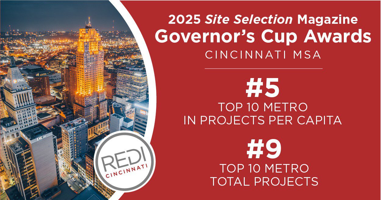 CINCINNATI – For the 21st straight year, Site Selection magazine has recognized the Cincinnati Region as a Top 10 Metro for corporate facility investment in multiple categories as part of its 2025 Governor’s Cup Awards. Cincinnati ranked #9 in total projects and #5 in projects per capita.
